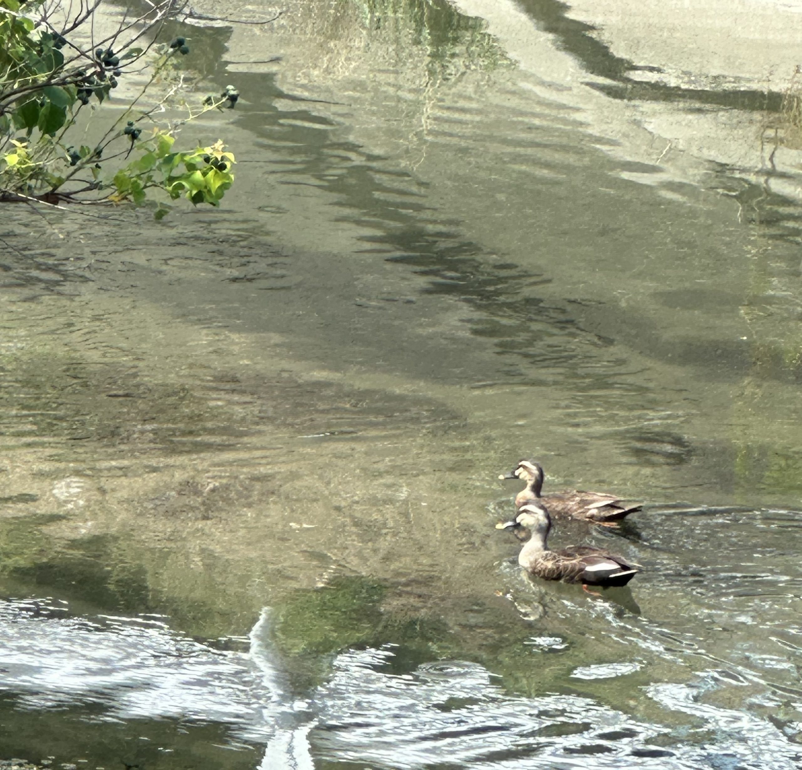 鴨のつがいです。自転車で買い物に行く途中で出会いました。北方のごみ処理場の前の小川にいました。北方は糸貫川の伏流水が流れていて、水質も抜群によいらしく、ついこのごろ、近くに水のペットボトルを作る会社ができました。わーい! 毎日おいしい水を飲んでいまーす。