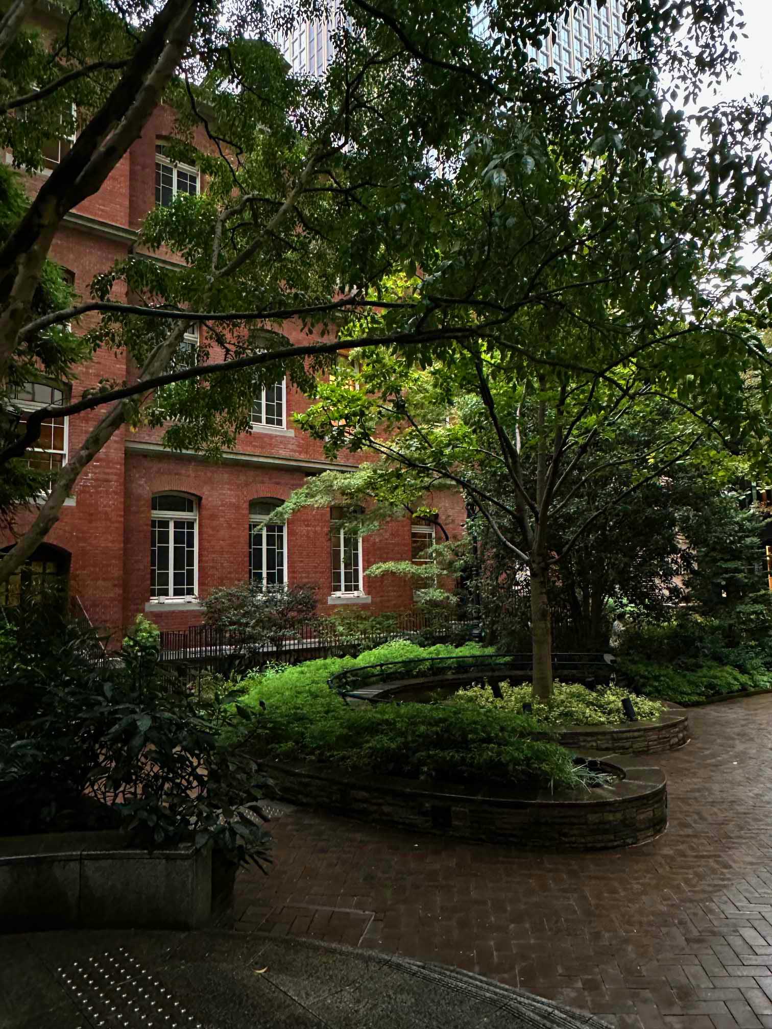 少し小雨がパラついていました。三菱のビルの谷間の庭です。しっとりと落ち着いた感じでとても気に入りました。レンガの敷き方が手間がかかっているようですが、それが重厚な感じがして大好きです。お茶するところがあったので、ちょっとひと休み。落ち着きます。