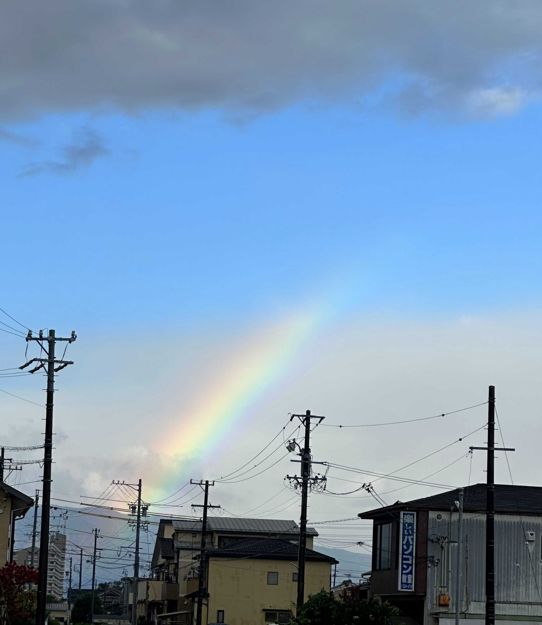 早朝に少しパラパラしましたが、今はすっきり晴れています。8時ごろ、バス停で気が付きました。半円の左下のほうだけの虹が見えます。すぐ手が届きそうなぐらい近くに見えます。そのうえ嬉しいことに一番下の紫いろの部分まではっきり見えます。今日は良いことがありそうです!!