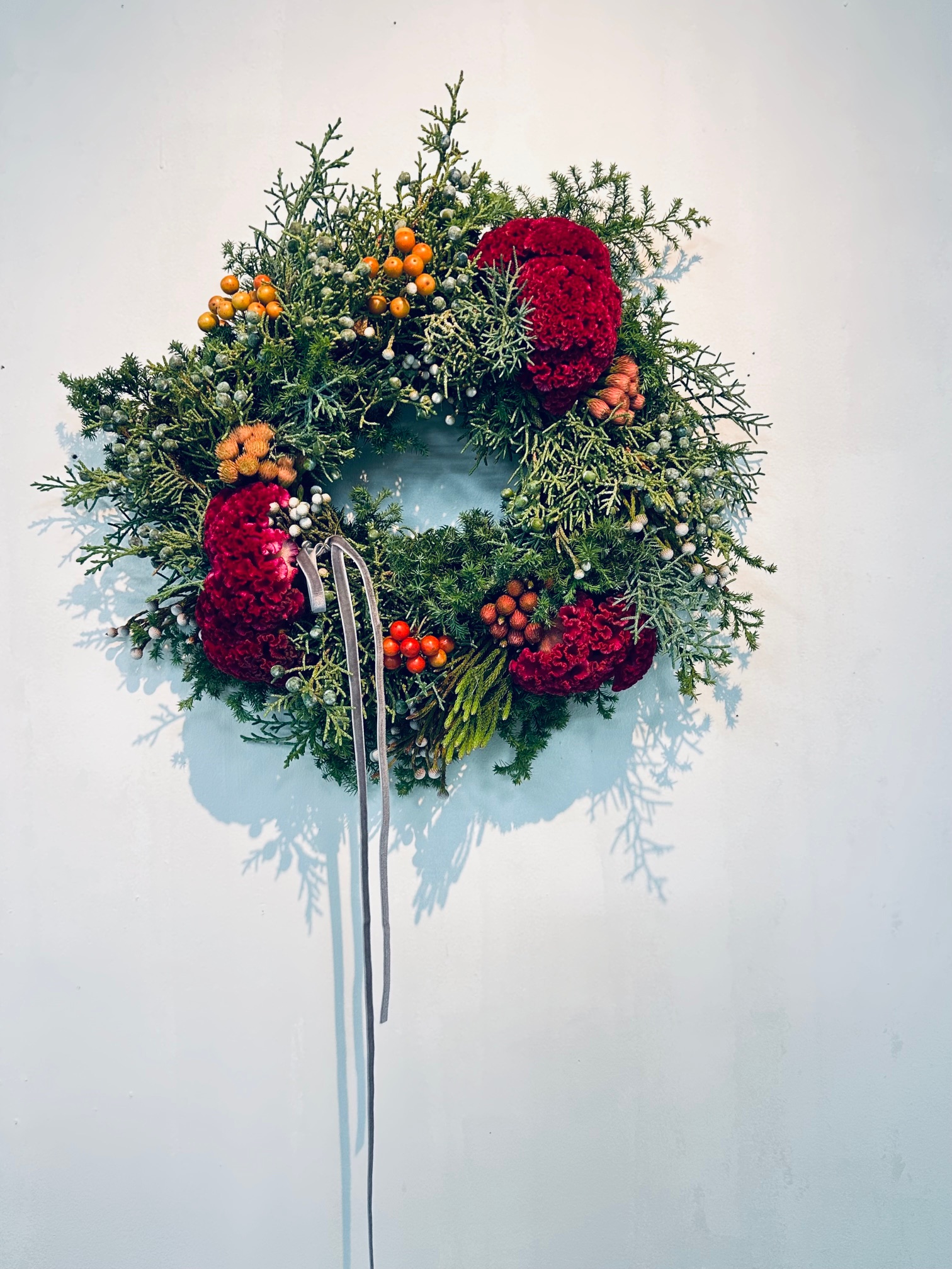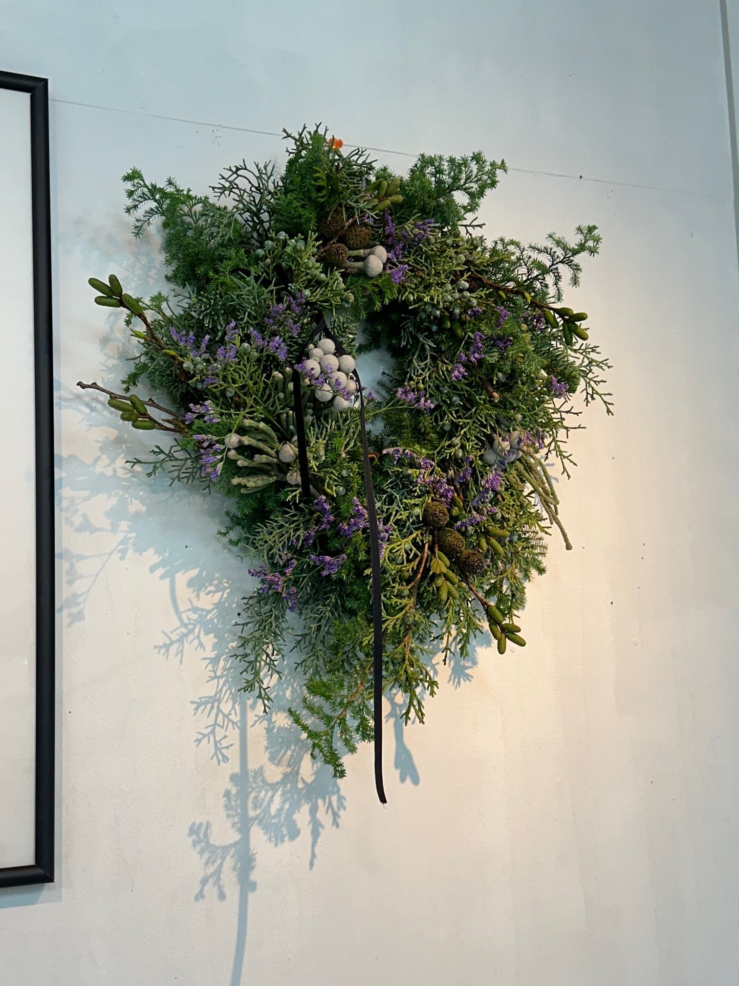 X’masリースを作りました。「永遠」「魔除け」「豊作祈願」。冬でも枯れない常緑樹が使ってあるから、すぐに枯れ葉の色にはなりません。長い時間、緑が楽しめます。丸いリースの形がやわらかな感じ。X’masが近いなー。今年はどこのケーキ食べる?。話題はケーキのほうにいってしまいます。平和な時間です。