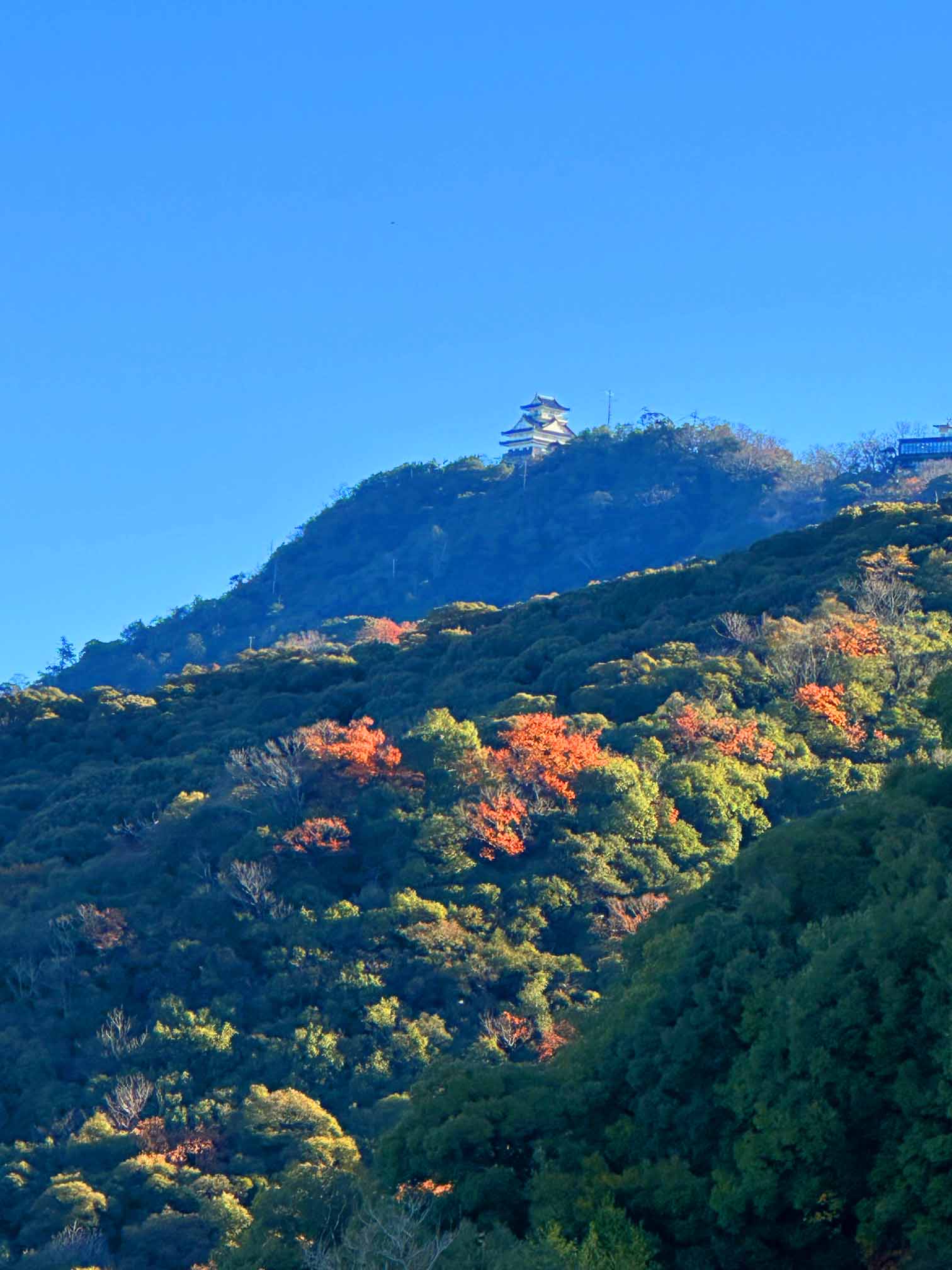 金華山は紅葉する木が少ないとは聞いていましたが、本当に少ない。やっと数本の木が赤く色づき始めました。これはこれで美しい景色です。私はiPhone14なので、望遠レンズが弱い。これが精いっぱい引っぱった画像です。お城の足元の樹木を伐採したので、石垣まで見えるようになりました。小さくて可愛い山城の姿が大好きです。
