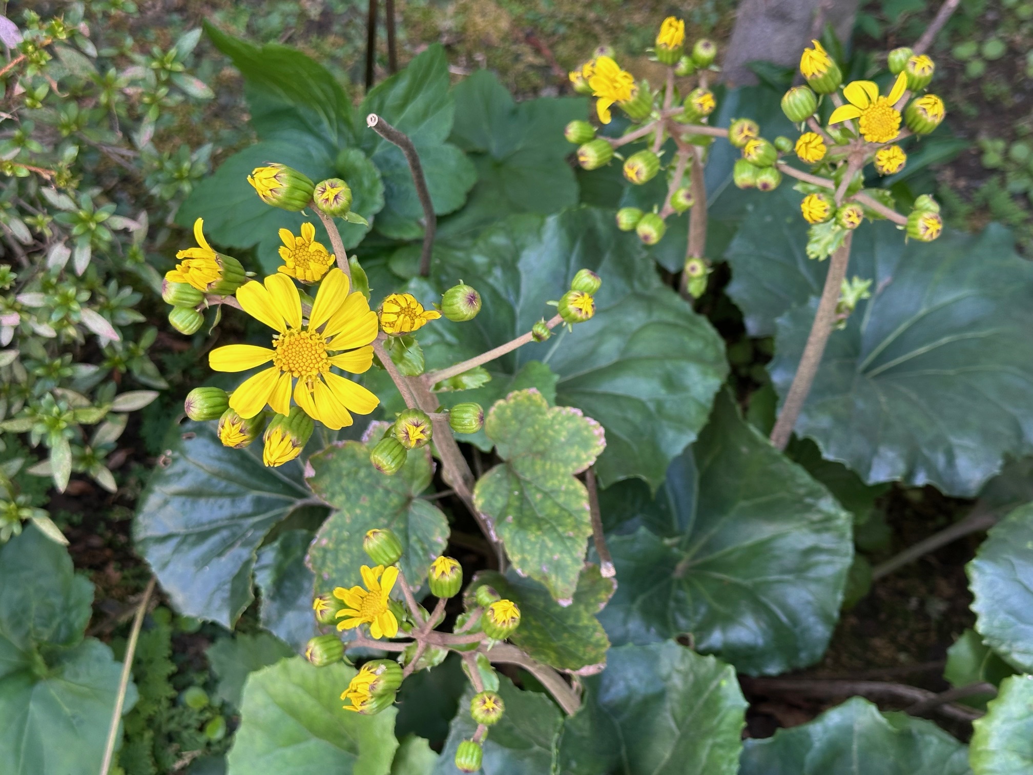 庭のツワブキが咲き始めました。この花が顔を出し始めると、厳しい冬が近い証拠です。毎年手入れも何もしないのに、咲きます。さすがに今年は暑かったから、葉っぱが枯れてしまい、もうだめかと思っていたので余計に嬉しい。黄色は目立つので、満開になると庭がにぎやかになります。期待しています。