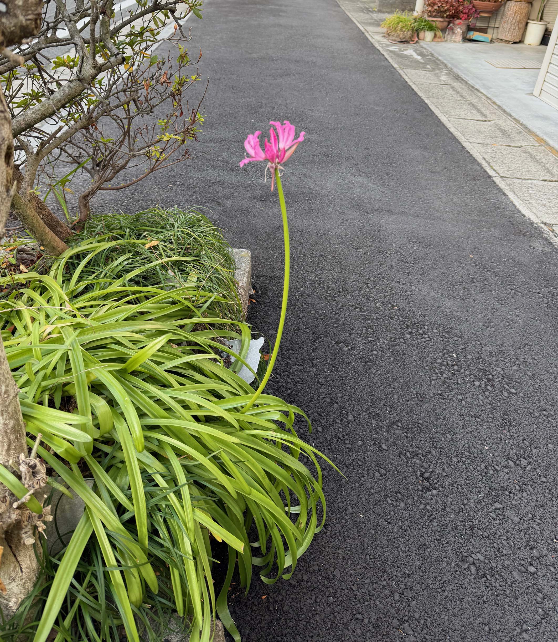 出勤途上の道端に、こんなにきれいな花が~~。オリズルランだそうです。春の花です。こういった華奢な花を、こんな寒い時期に見ると “エッ” と思います。そしてなんて美しい、がんっばってるね、と声を掛けたくなります。思わずニコッとしてしまいます。