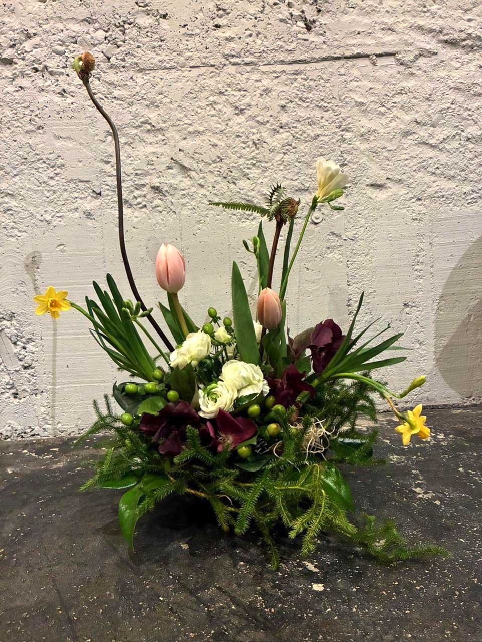 テーマは ”春の息吹を楽しむ” 山に行くと、一番早いのは枝先をぐるぐる巻いて綿帽子をかぶったゼンマイがです。春一番の出会いです。チューリップ、レナンキュラスなど、まさに春春はる。岐阜は今朝雪が降りました。まだまだこれからです、春一番を先取りです。