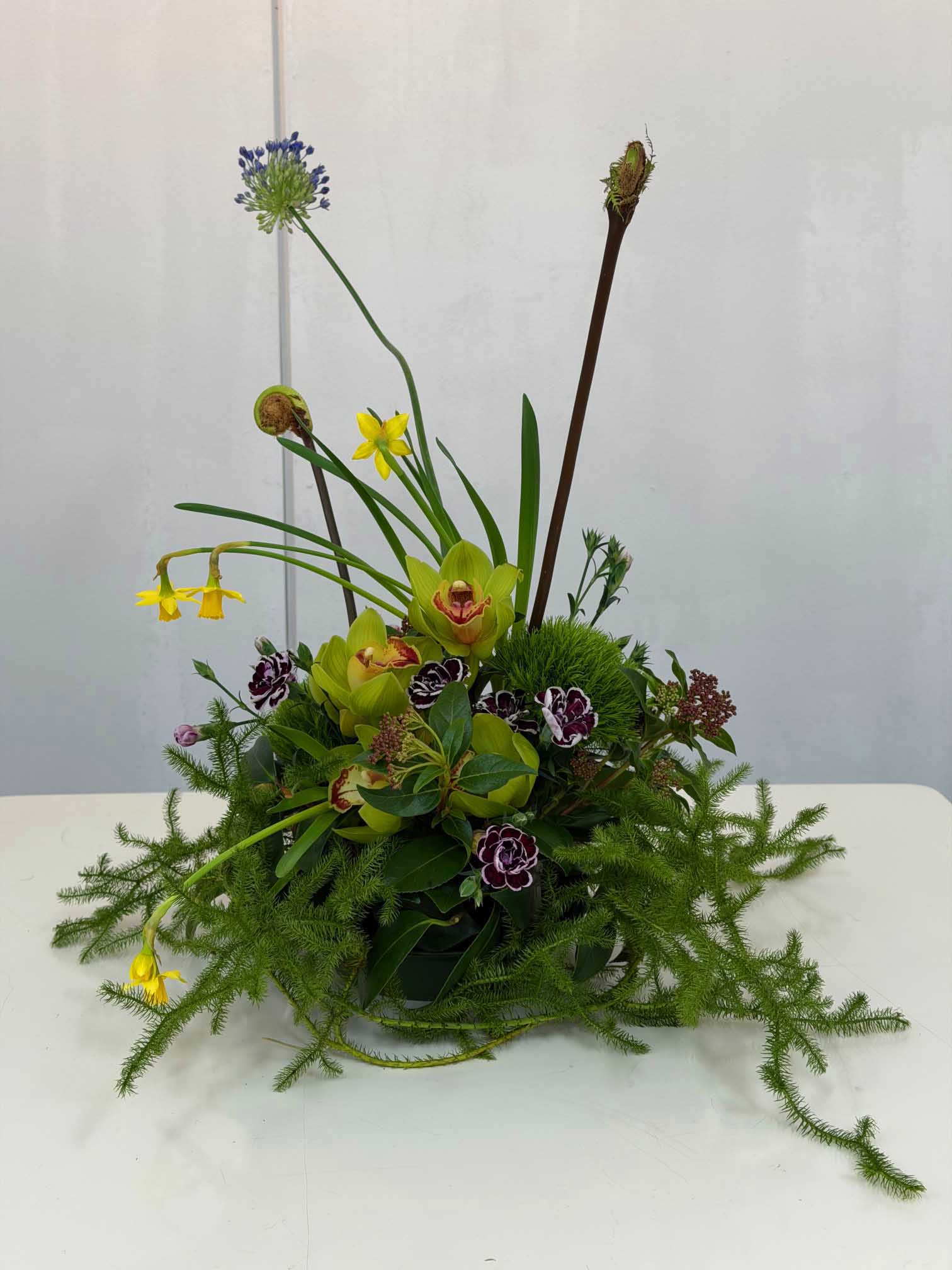今月はヤブ用でレッスンに行けませんでした。先生が活けてくださいました。さすがさすが迫力があります。メインの蘭が風格があって素晴らしい。テーブルの上に枝先を広げて、裾ひろがりの安定感を演出するなんて思いもかけませんでした。お花は楽しいです。有難うございました。