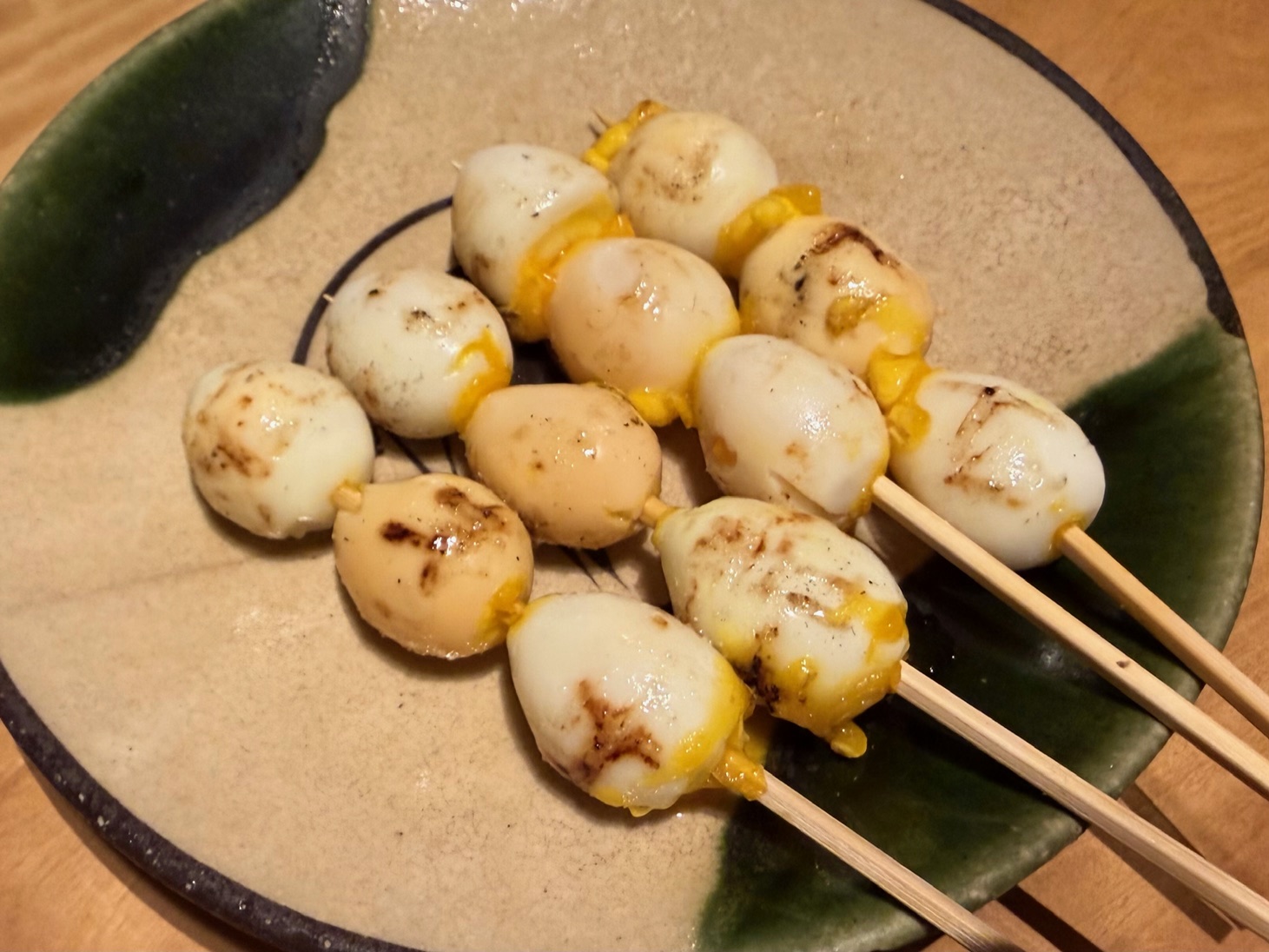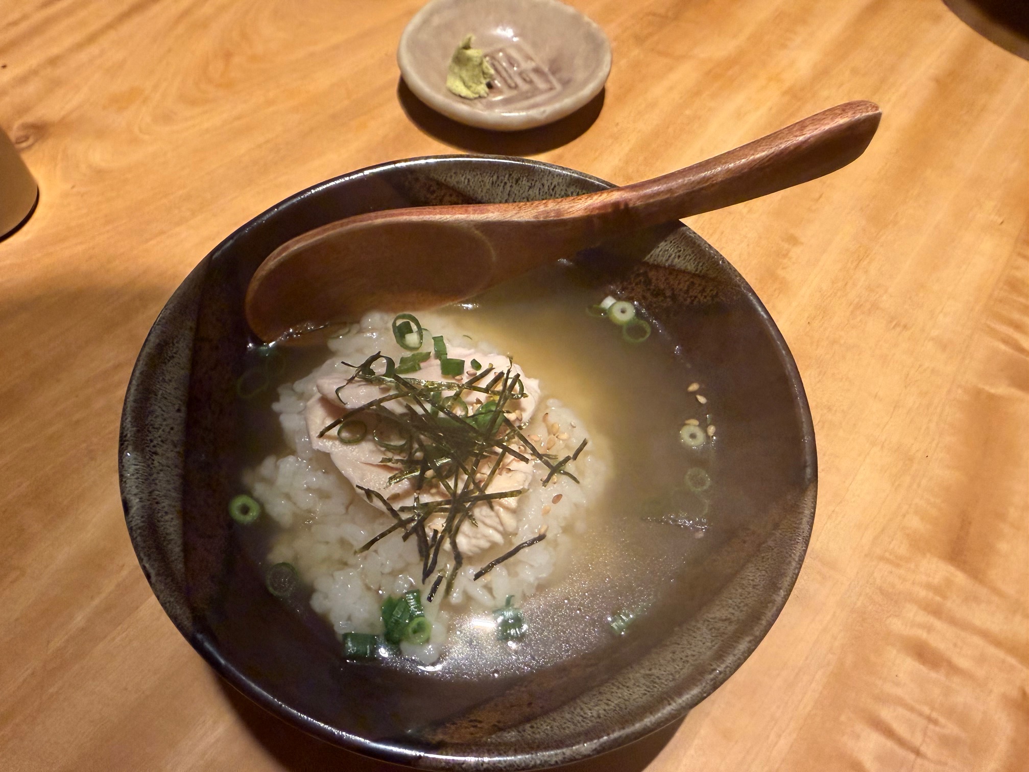 柳ケ瀬のちょっと高級な感じの焼き鳥屋さんで夕食をとりました。器が多治見の焼き物で、和の暖かさが伝わってきます。まず器に惚れました。焼きたて焼き鳥はさすがに美味しい。私が最も嬉しかったの ”とりがらスープの茶漬け”。さっぱりしていてこくがあって、サラサラで~~ 珍味です。また行たいです。