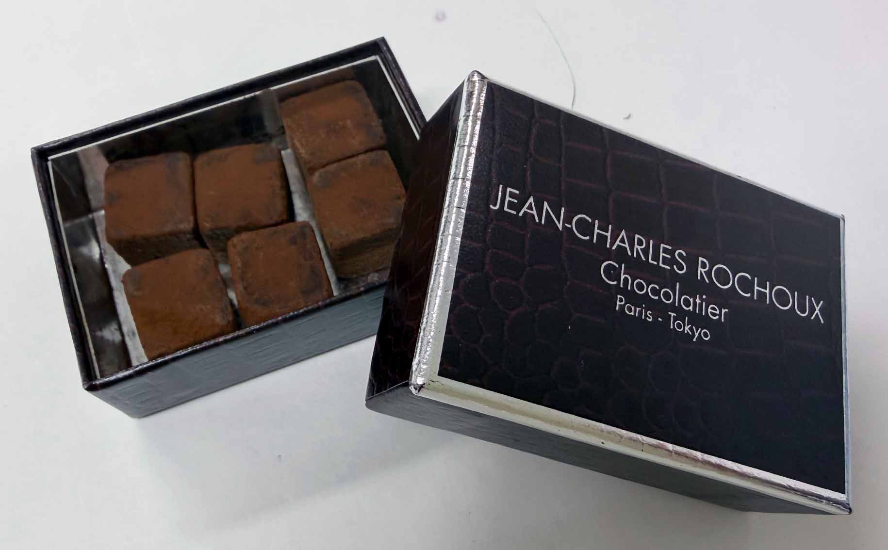 紳一のフランス土産に生チョコを貰いました。ジャン・シャルル・ロシューのチョコです。日本には東京南青山に1店舗のみあるらしい。初めての味の生チョコです。一粒1000円の生チョコ、味わっていただきました。複雑微妙な美味しさ、言葉ではいいあらわせません。美味しい。値段を調べてみたから、よけい美味しいのかも?