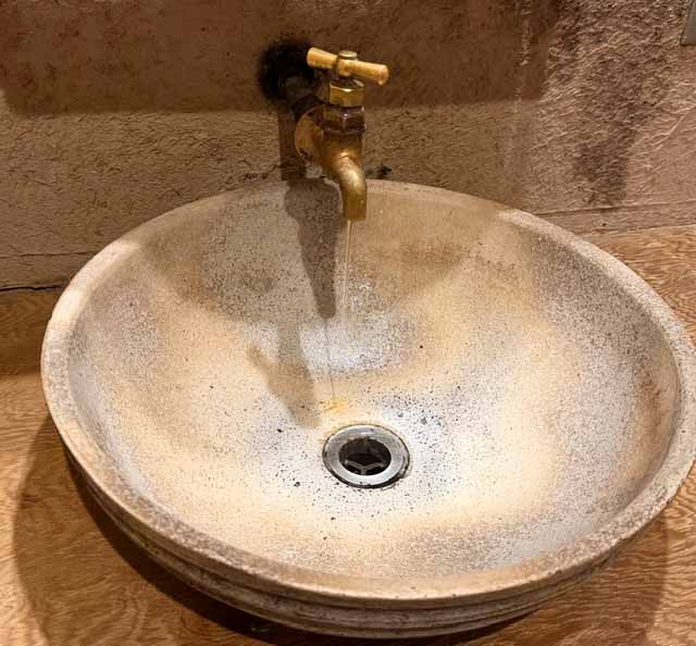 レトロな雰囲気の真鍮の水道蛇口を蕎麦屋さんで見つけました。でっかい陶器の洗面台も時代物で、なかなか味がある色です。見ていて落ち着きます。パッキングが古いせいか、しっかり閉まりません。水がチョロチョロ出ているのも なんだかご愛敬です。(笑)