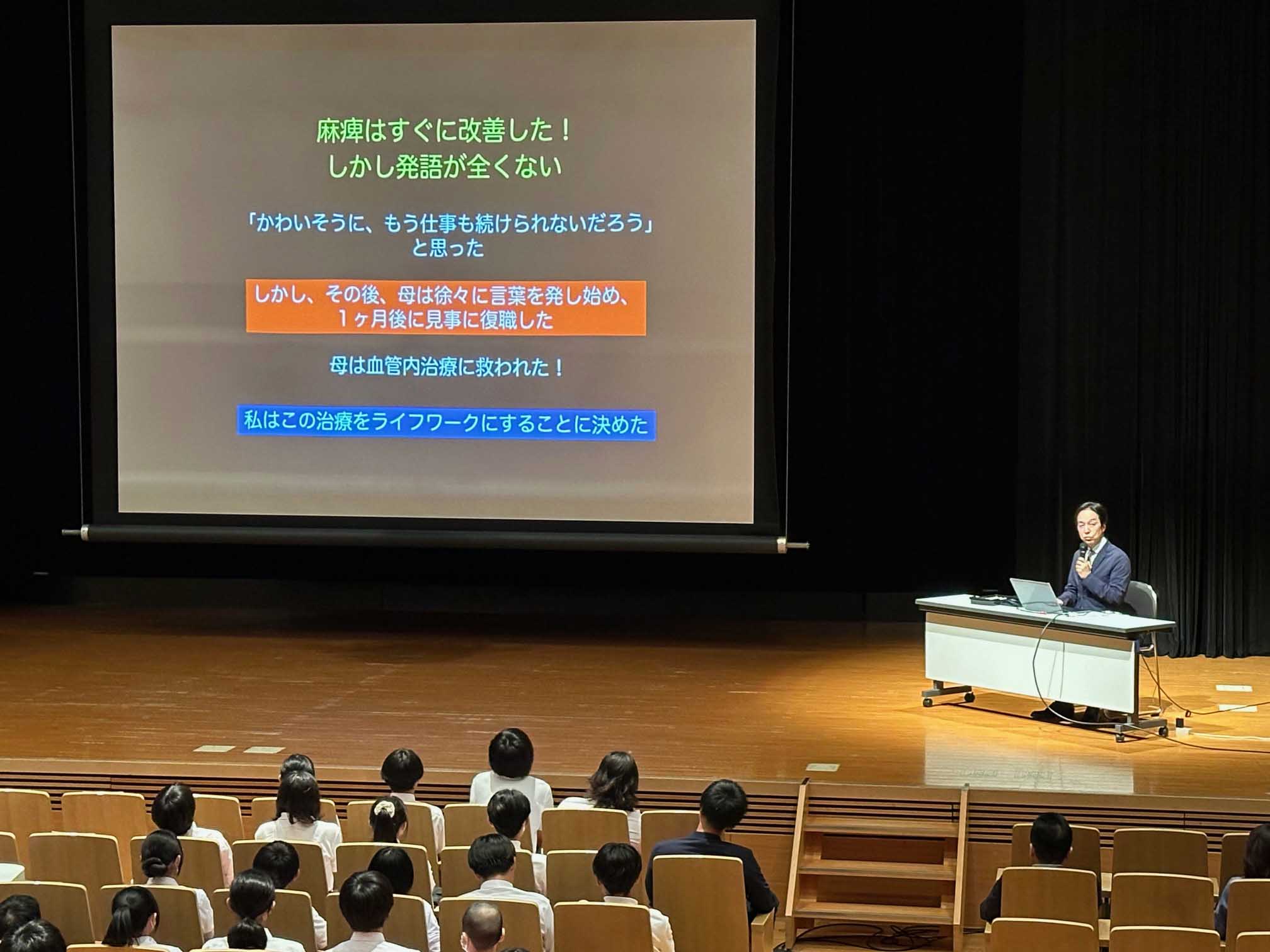 紳一が母校で中学3年生を対象にした講演会を~。「脳外科の現場から北方学園の皆さんへ」というテーマです。いきなり私が脳梗塞をおこした時のことがアップで出てきました。そういえばあの当時まだ珍しかったカテーテル治療(血管内治療)をやってくれて、切らないで治っちゃいました。半身不随になるところでしたねー。感謝感謝です。質疑応答はどうしたら成績が上がるか?塾はどう利用すればよいか?など、現実的な悩みがどんどん出てきます。内緒の勉強方法などを教えてもらって、学生さん達はやる気満々のニコニコ顔になっていました。講演会大成功かな。
